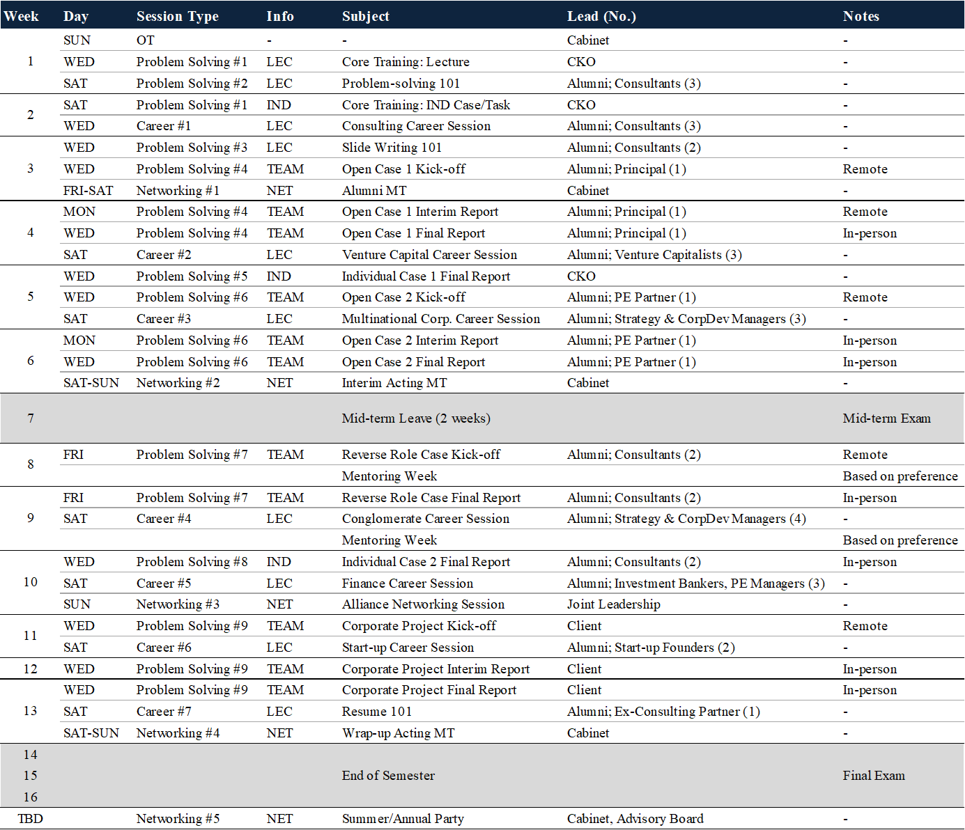프로페셔널로 성장하기 위한 기반을 마련합니다. 문제 해결의 기초를 다지는 Core Training 세션으로 시작해, Closed/Open Case 세션을 통해 치열하게 훈련하고, 학기 말에는 실제 고객사를 상대로 진행하는 산학협력 프로젝트를 통해 실전 경험을 쌓을 수 있도록 설계되었습니다. 이와 더불어 다양한 분야에서 활약하고 계신